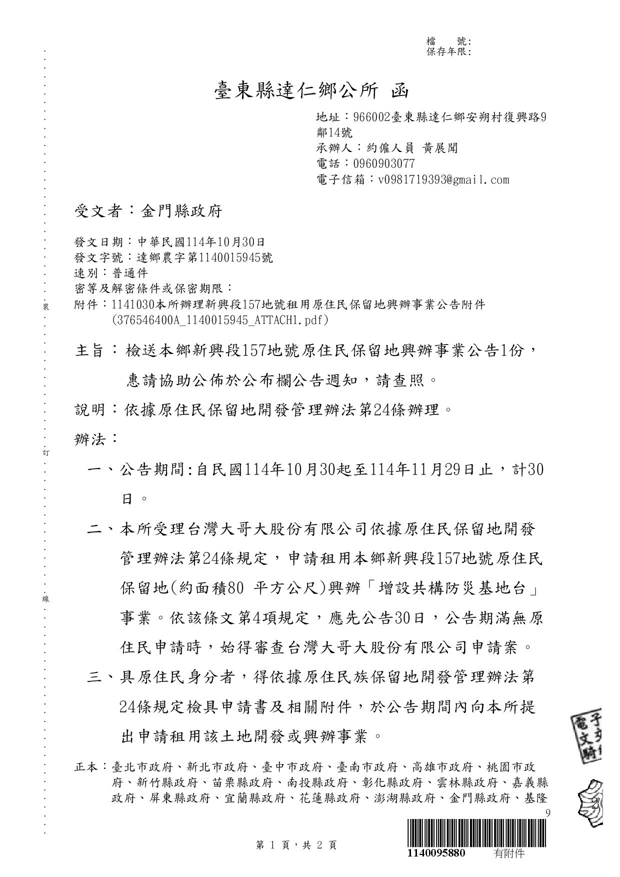 一、依臺東縣達仁鄉公所114年10月30日達鄉農字第1140015945號函辦理。