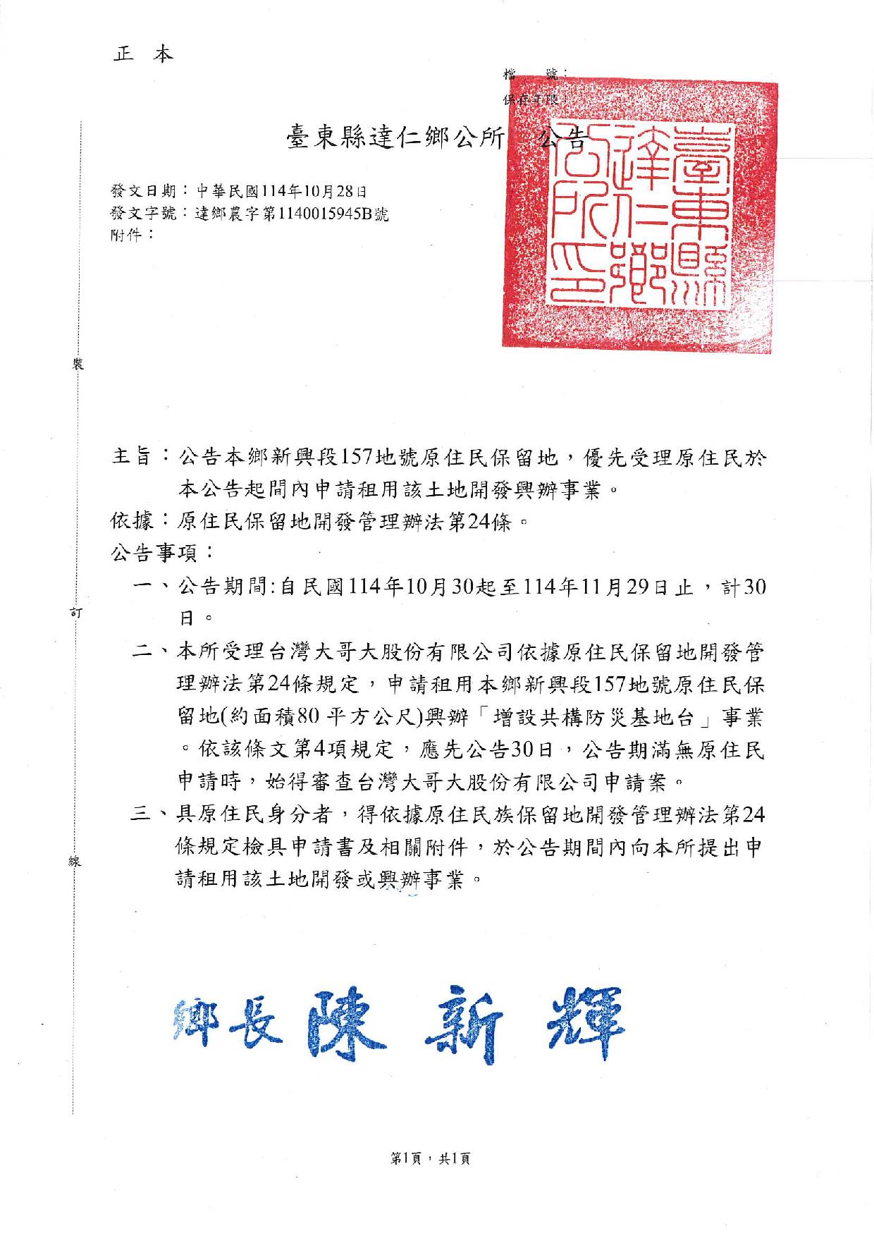 二、臺東縣達仁鄉公所受理台灣大哥大股份有限公司依據原住民保留地開發管理辦法第24條規定,申請租用臺東縣達仁鄉新興段157地號原住民保留地(約面積80 平方公尺)興辦「增設共構防災基地台」事業。依該條文第4項規定,應先公告30日,公告期滿無原住民申請時,始得審查台灣大哥大股份有限公司申請案。